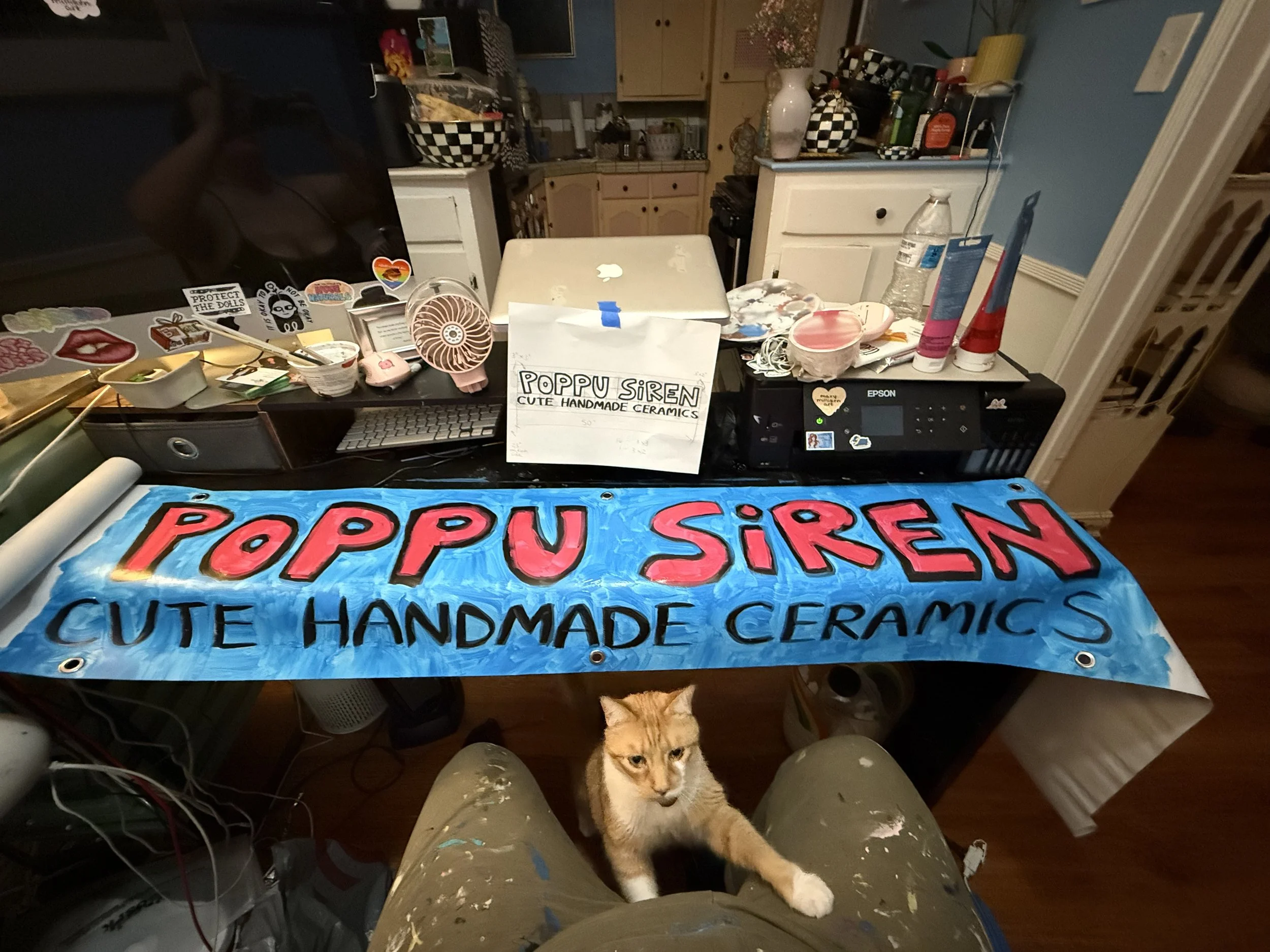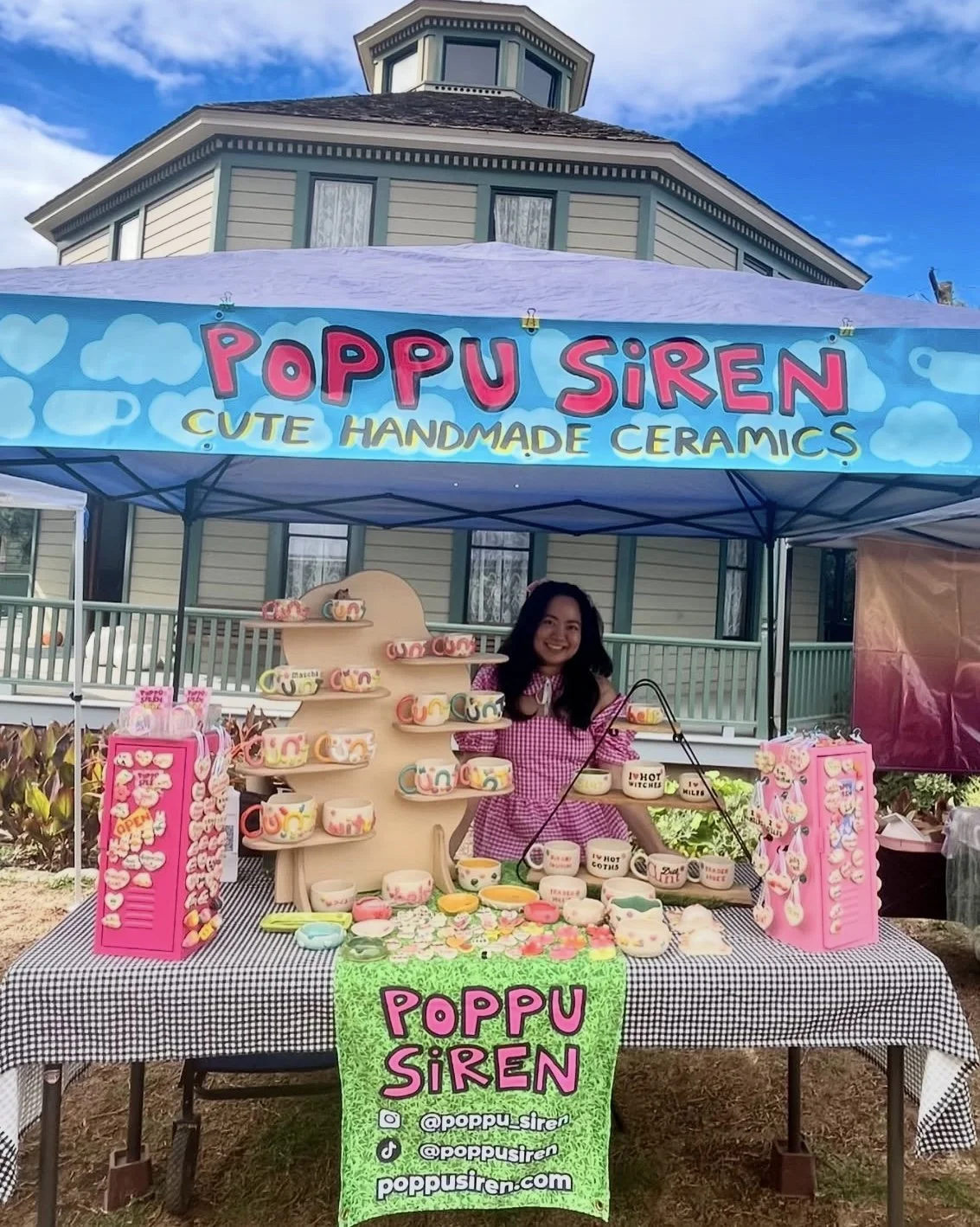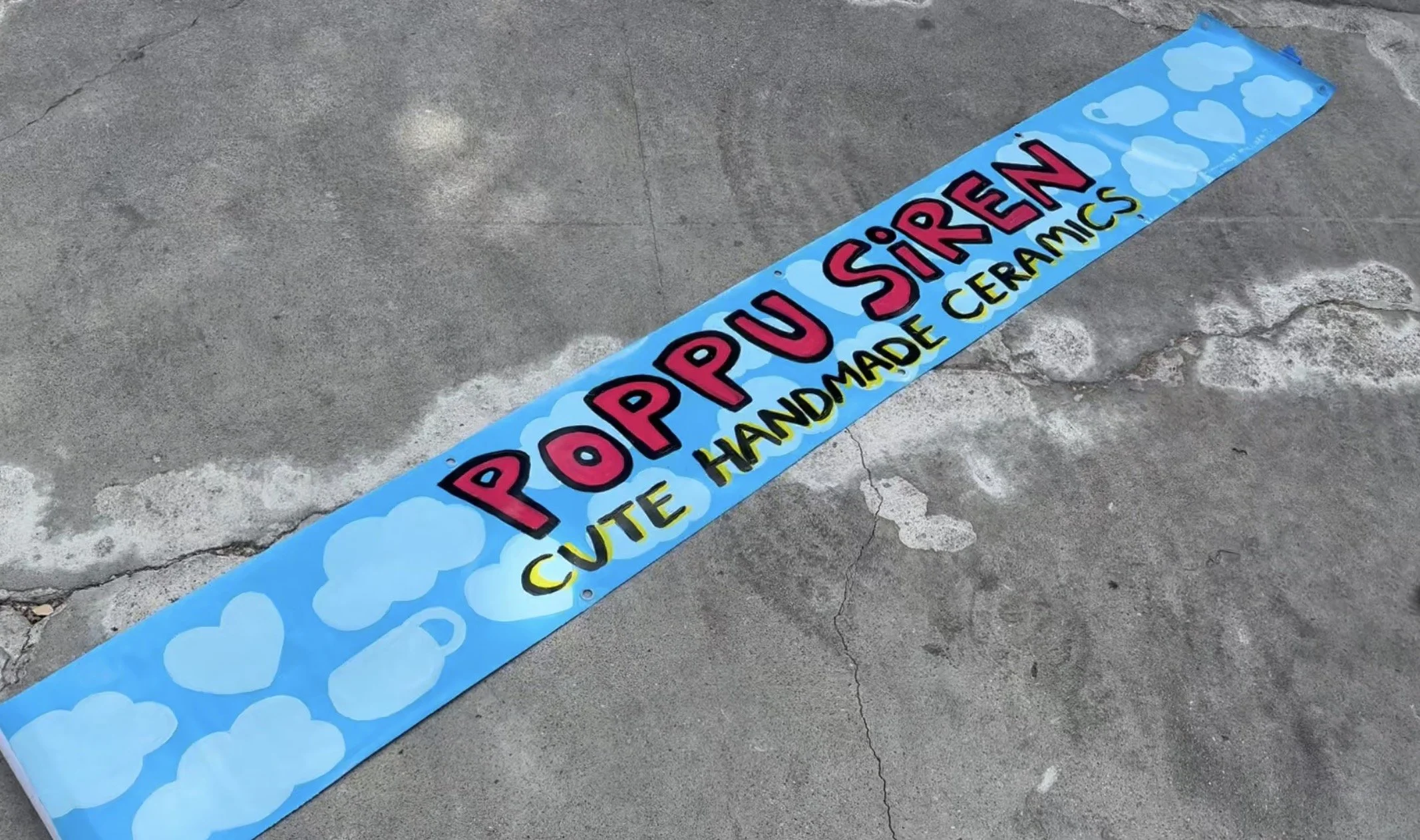 Custom hand-painted banner designed for ceramic brand Poppu Siren for use at outdoor market, featuring brand motifs to create consistency and flow between her signage, vendor setup, and physical products.