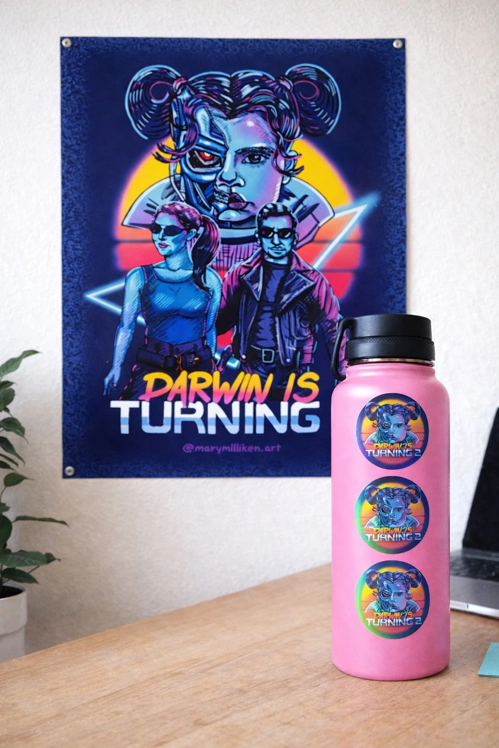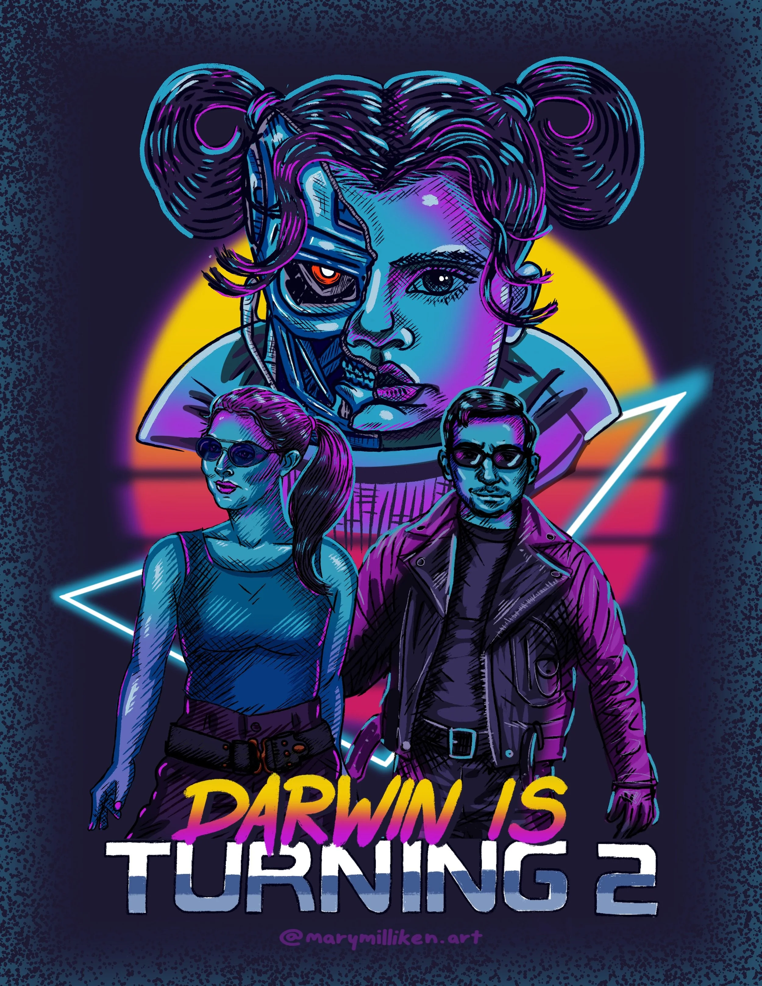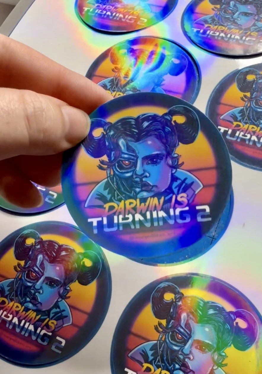 Illustrated poster and custom holographic stickers created for a retro, sci-fi themed birthday event, combining character illustration, bold typography, and neon color gradients with print production know-how.